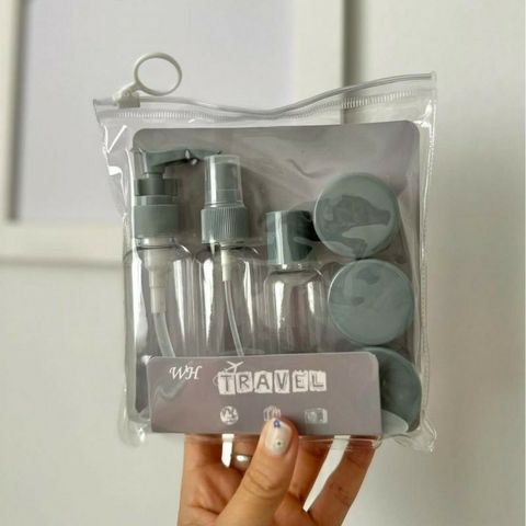 Incluye botellitas con tapa, spray, dosificador y potecitos, todo dentro de una práctica bolsa transparente con cierre hermético.